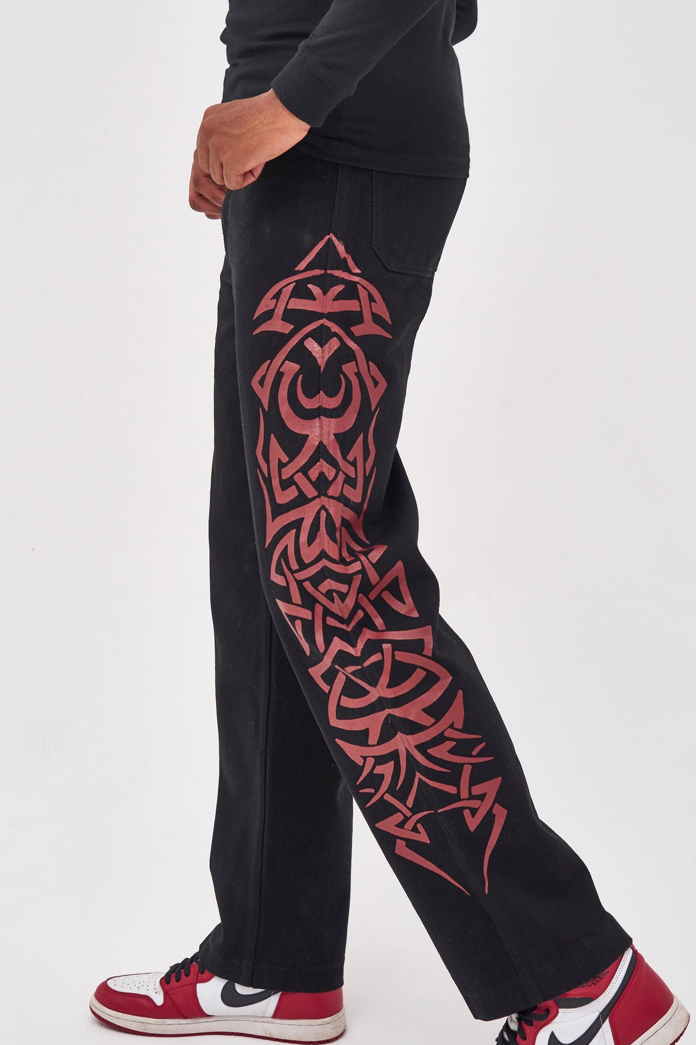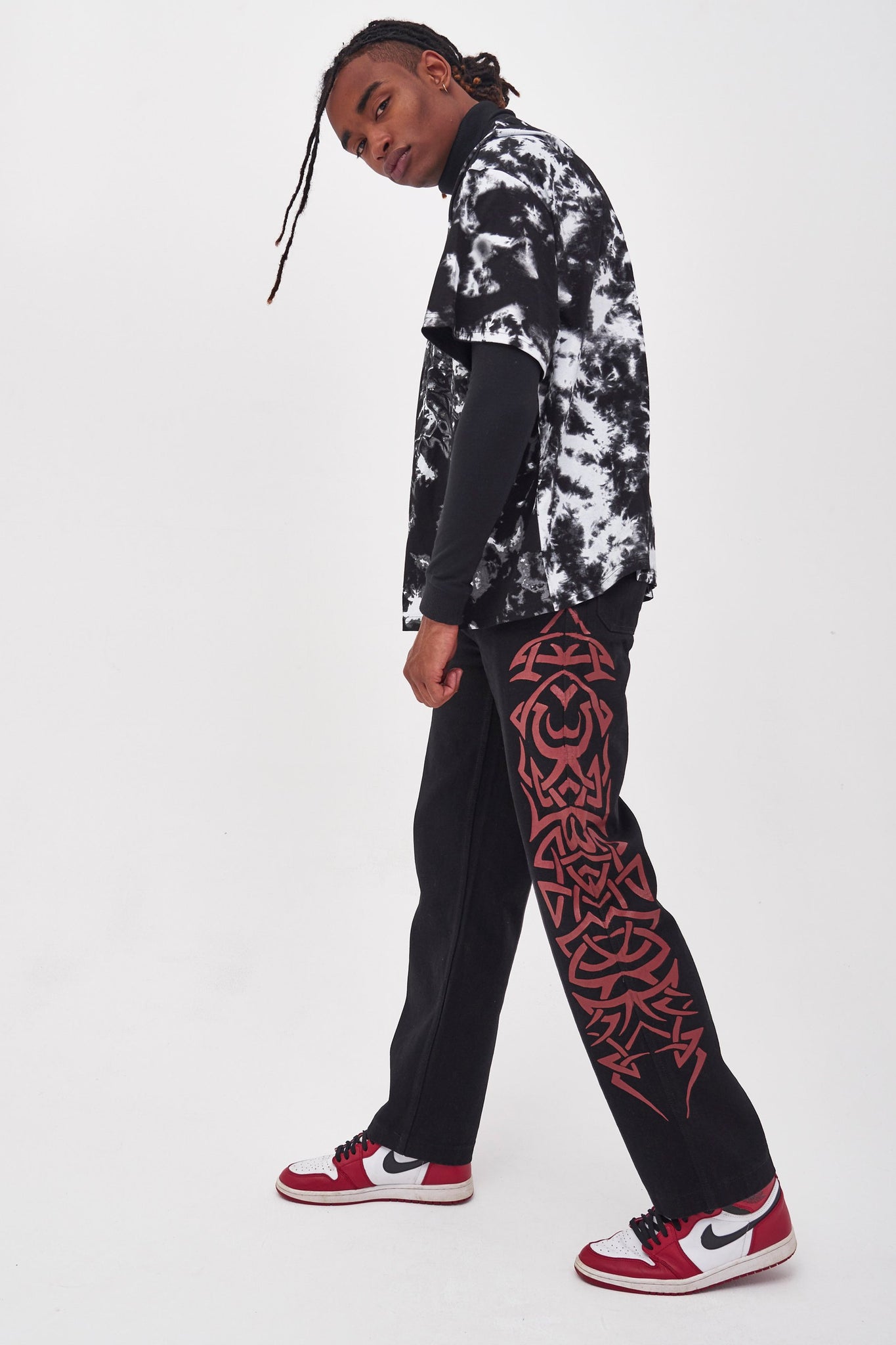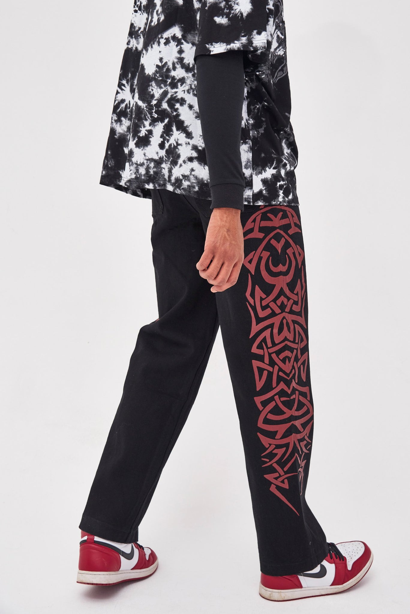 %text-1-start% Black Skate Fit Jeans With Red Tribal Detail