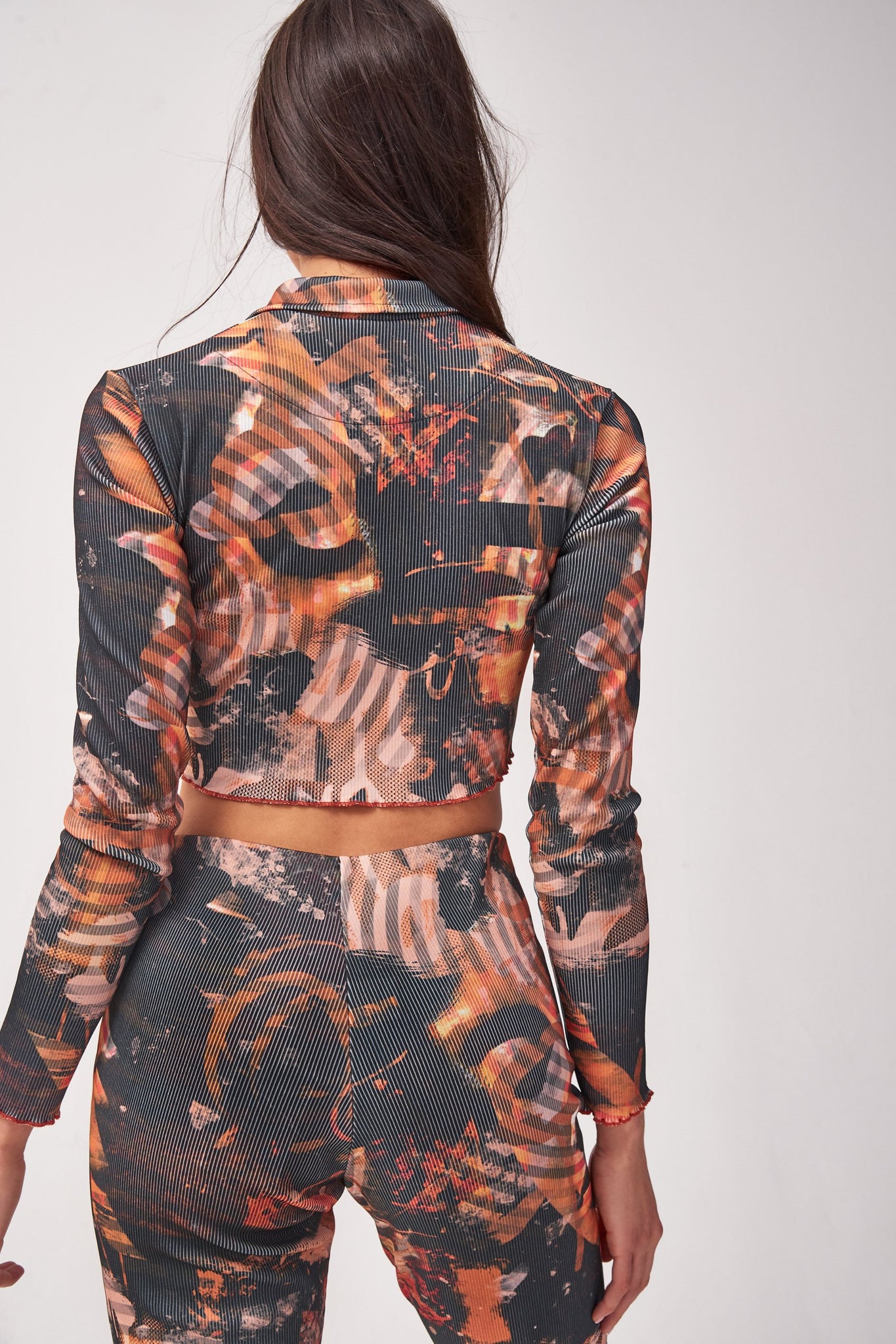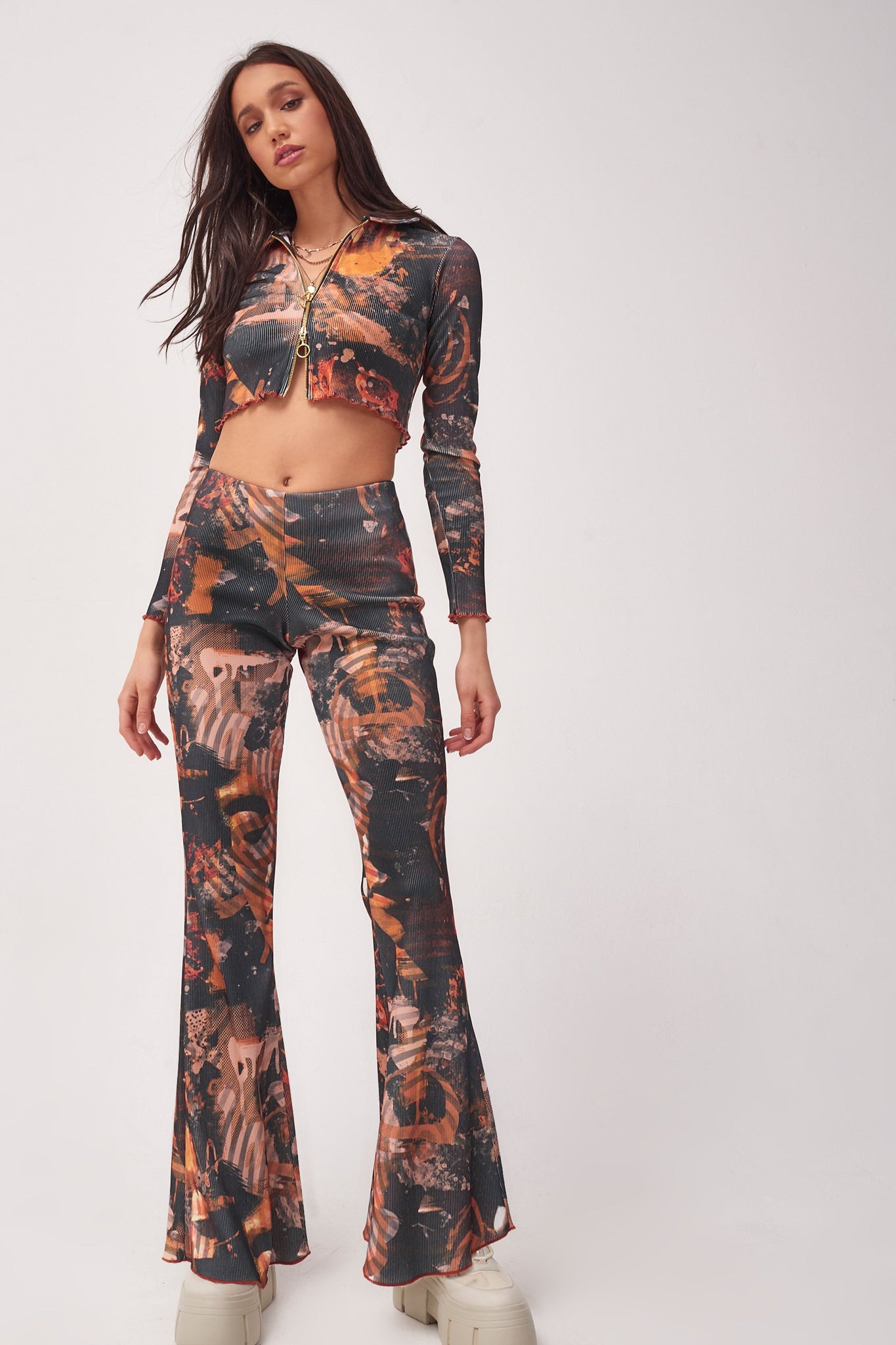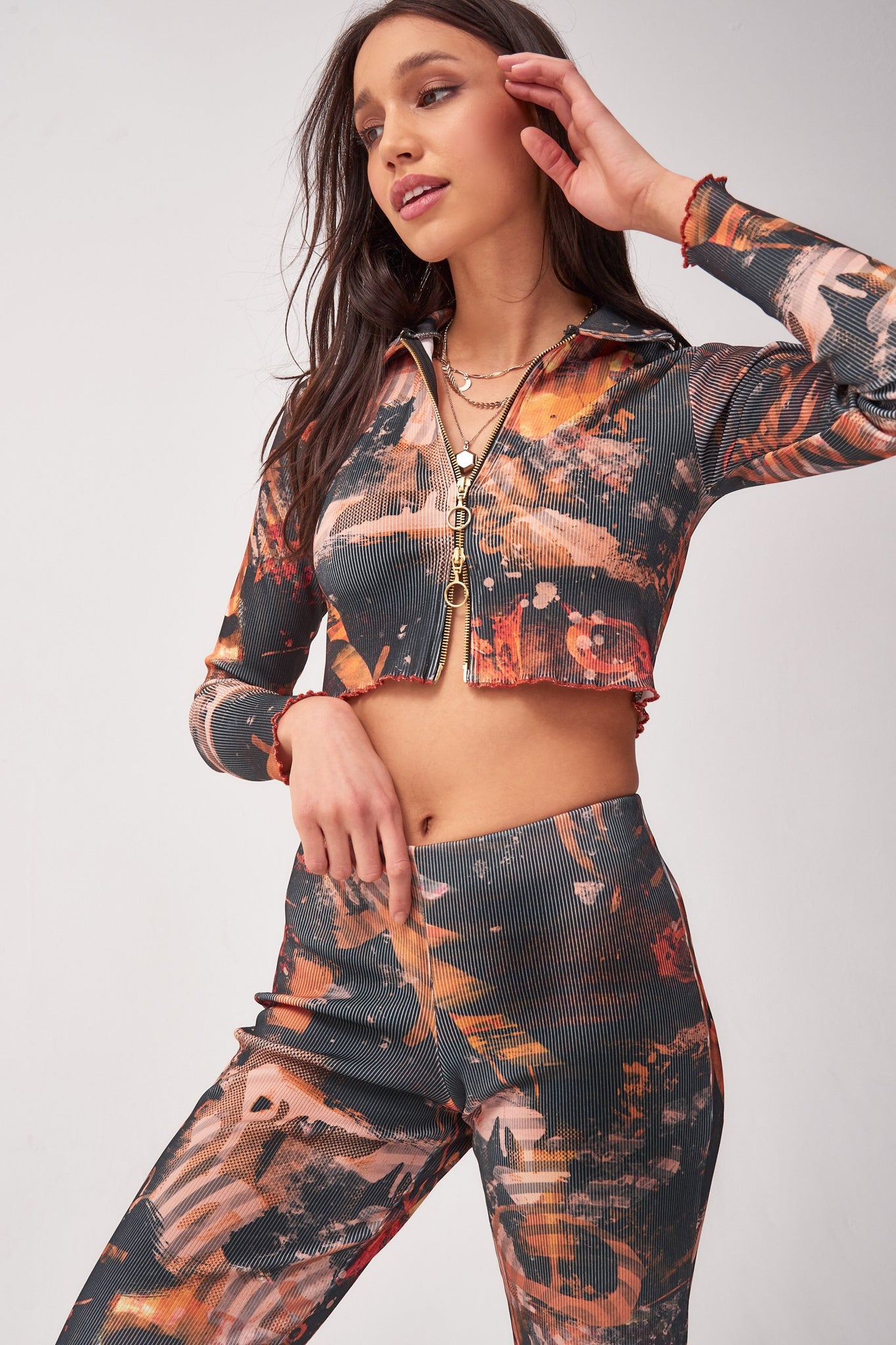 %text-1-start% Upgrade your wardrobe this season rocking our abstract burn print zip up ribbed cardigan!