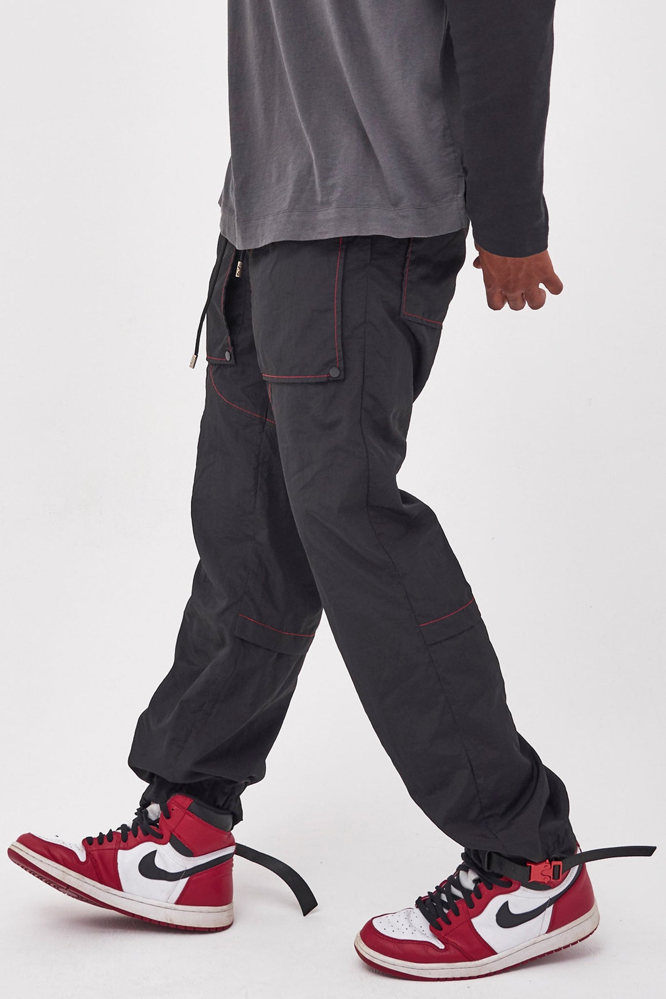 Black Nylon Joggers With Red Stitching Detail