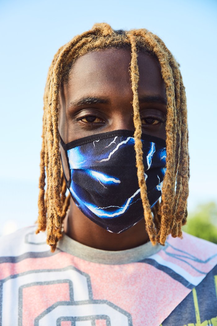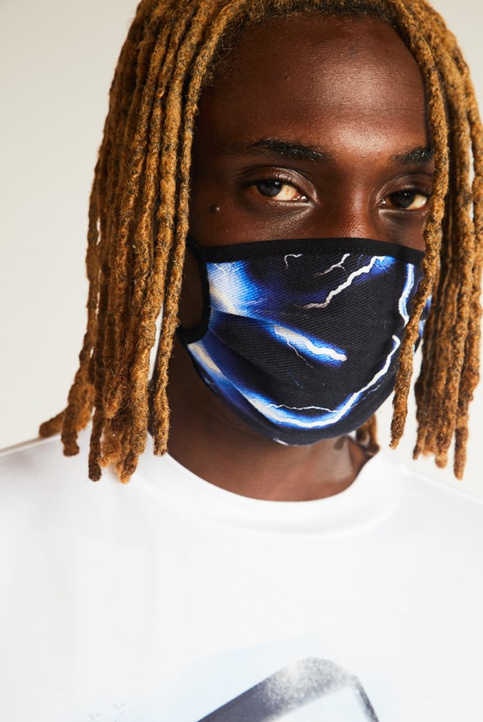 %text-1-start% Complete your look rocking our Blue Lightning Print face mask! £1 from every purchase goes to The Trussel Trust, providing foodbanks and practical support to help people in the UK during this crisis.