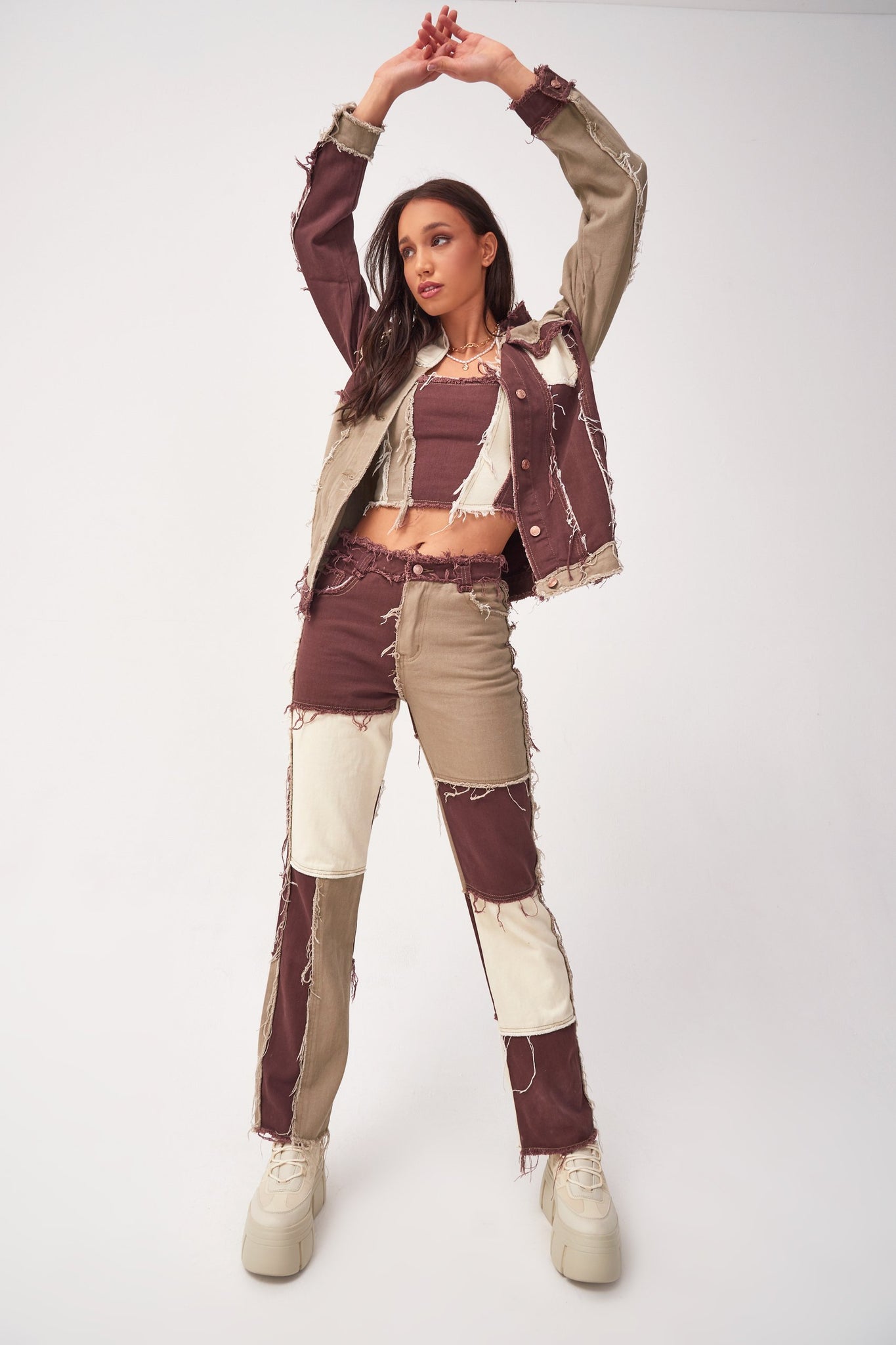 %text-1-start%Throw it back this season rocking our super cute brown oversized patchwork denim jacket, pair with the matching jeans, skirt & top for the ultimate co-ord!