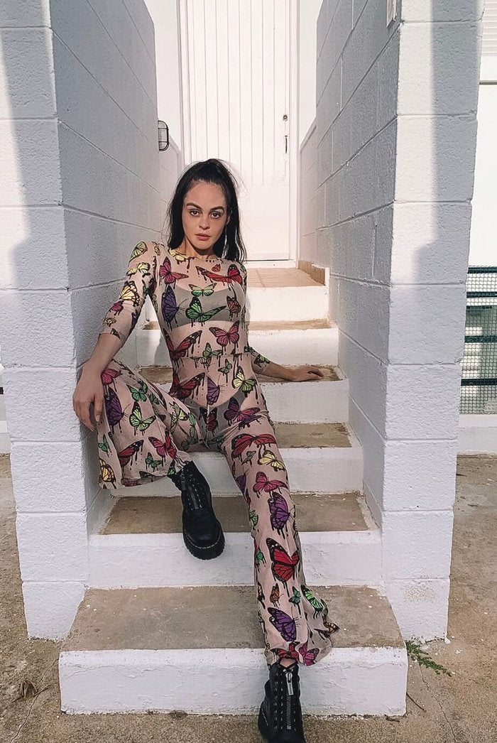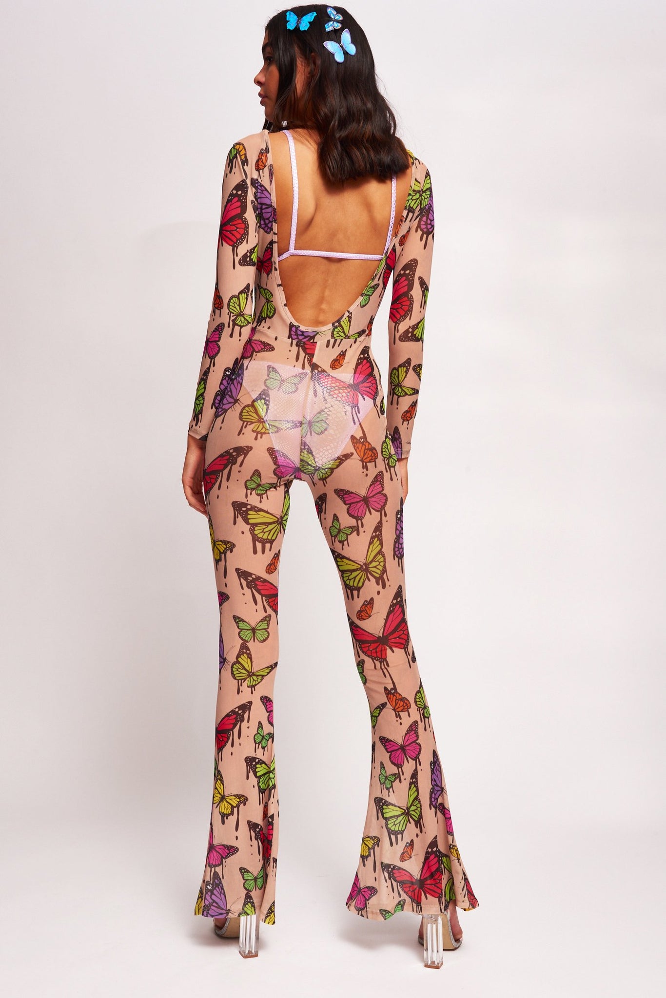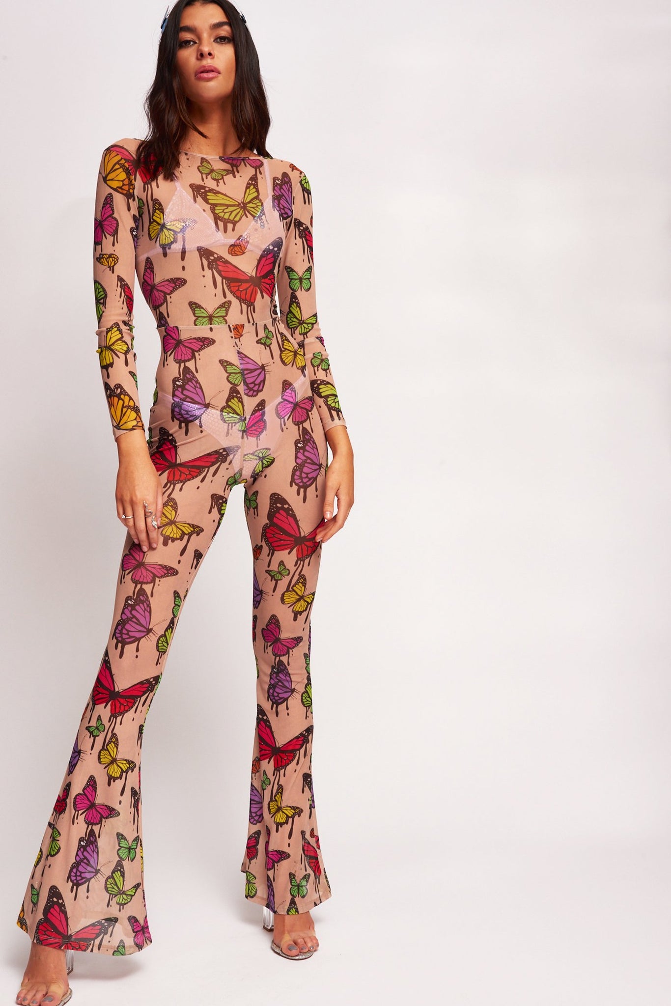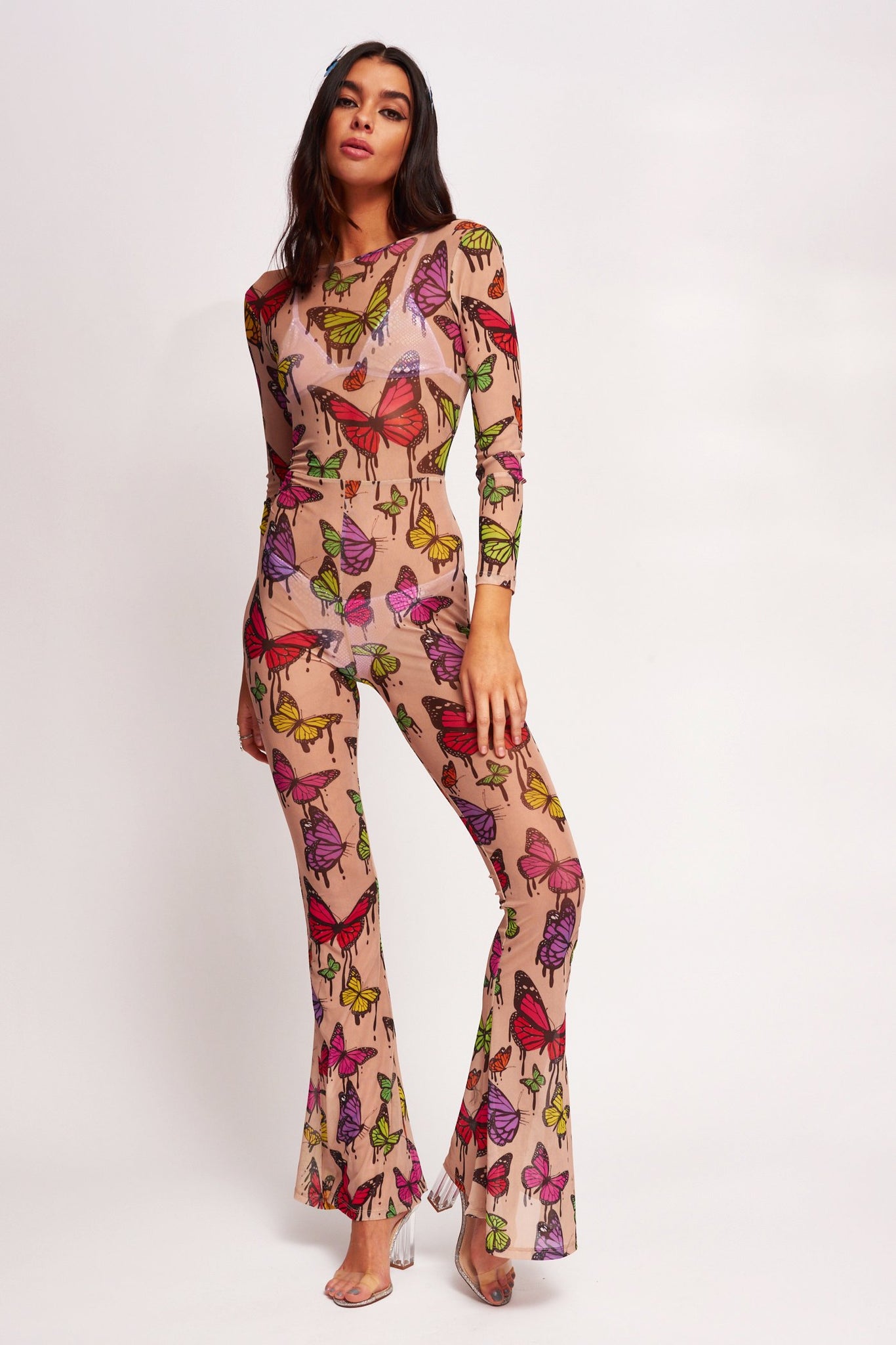 %text-1-start%Butterfly baby! Spread your wings this summer rocking our butterfly print mesh flared leg catsuit.
