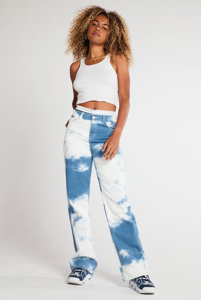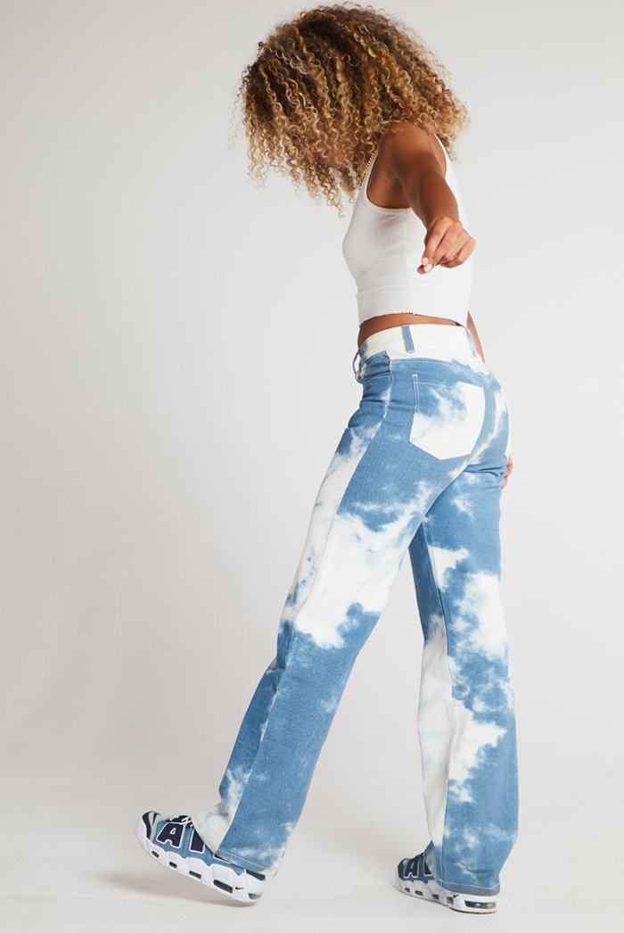 %text-1-start% Get your head out the clouds! Stand out this season rocking our super cute cloud print boyfriend fit jeans.