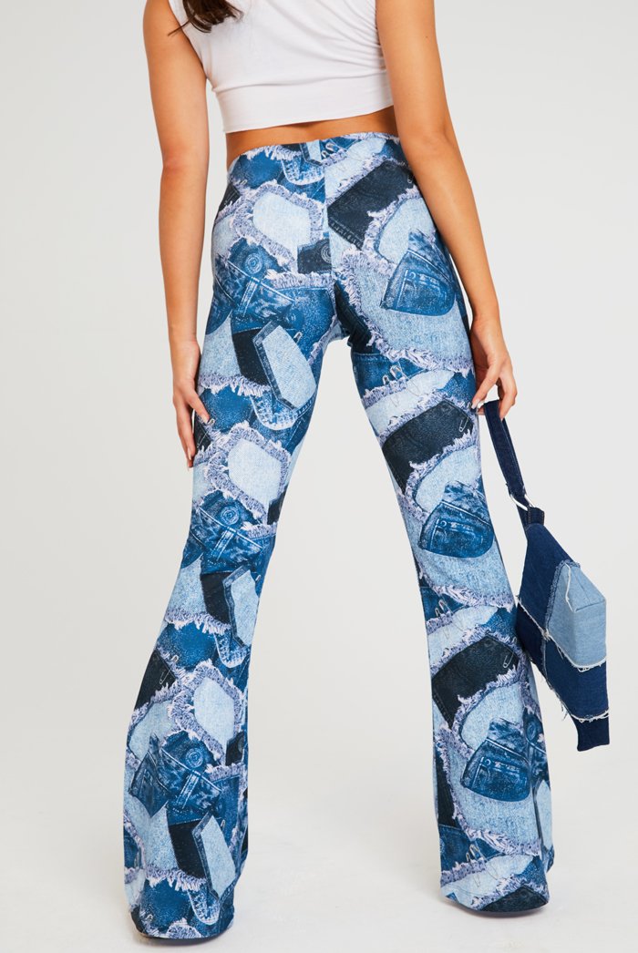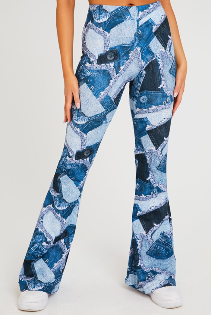 %text-1-start% Patch it up & go! be sure to chill out in style rocking our denim patchwork printed flares for ultimate chilled out vibes!