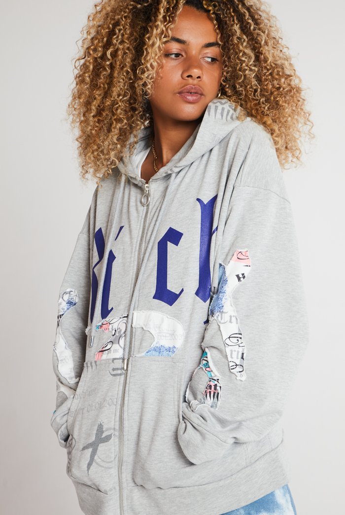 Distressed Jersey Print Oversized Zip Through Hoodie