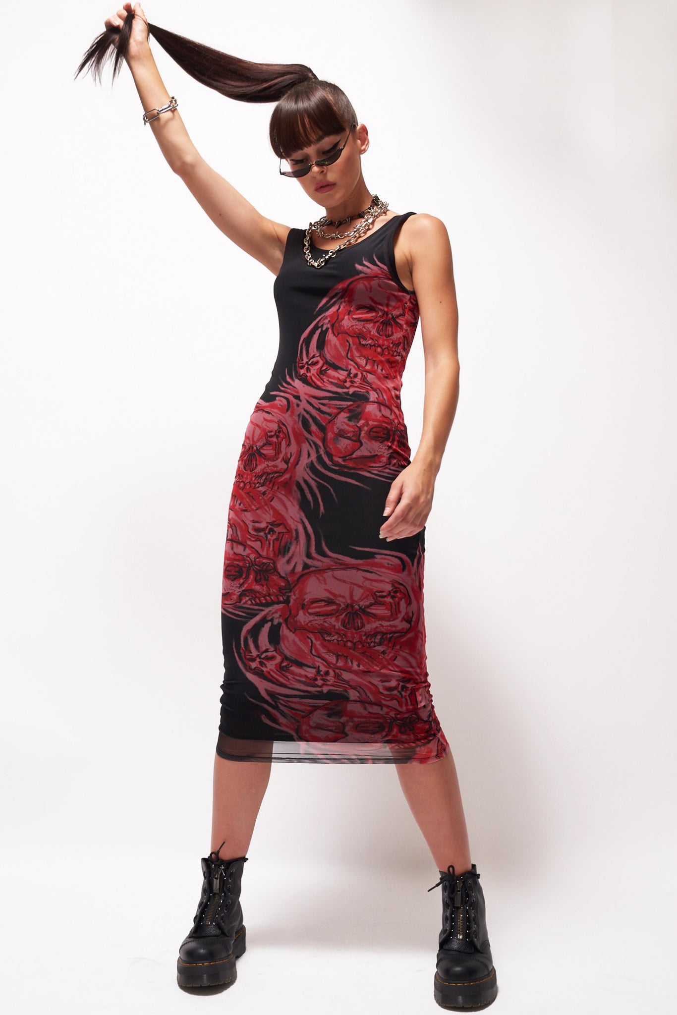 %text-1-start% Upgrade your wardrobe this season rocking our double layer rib & mesh skull print dress!