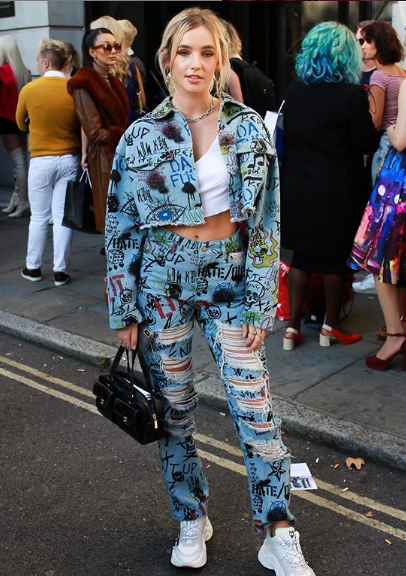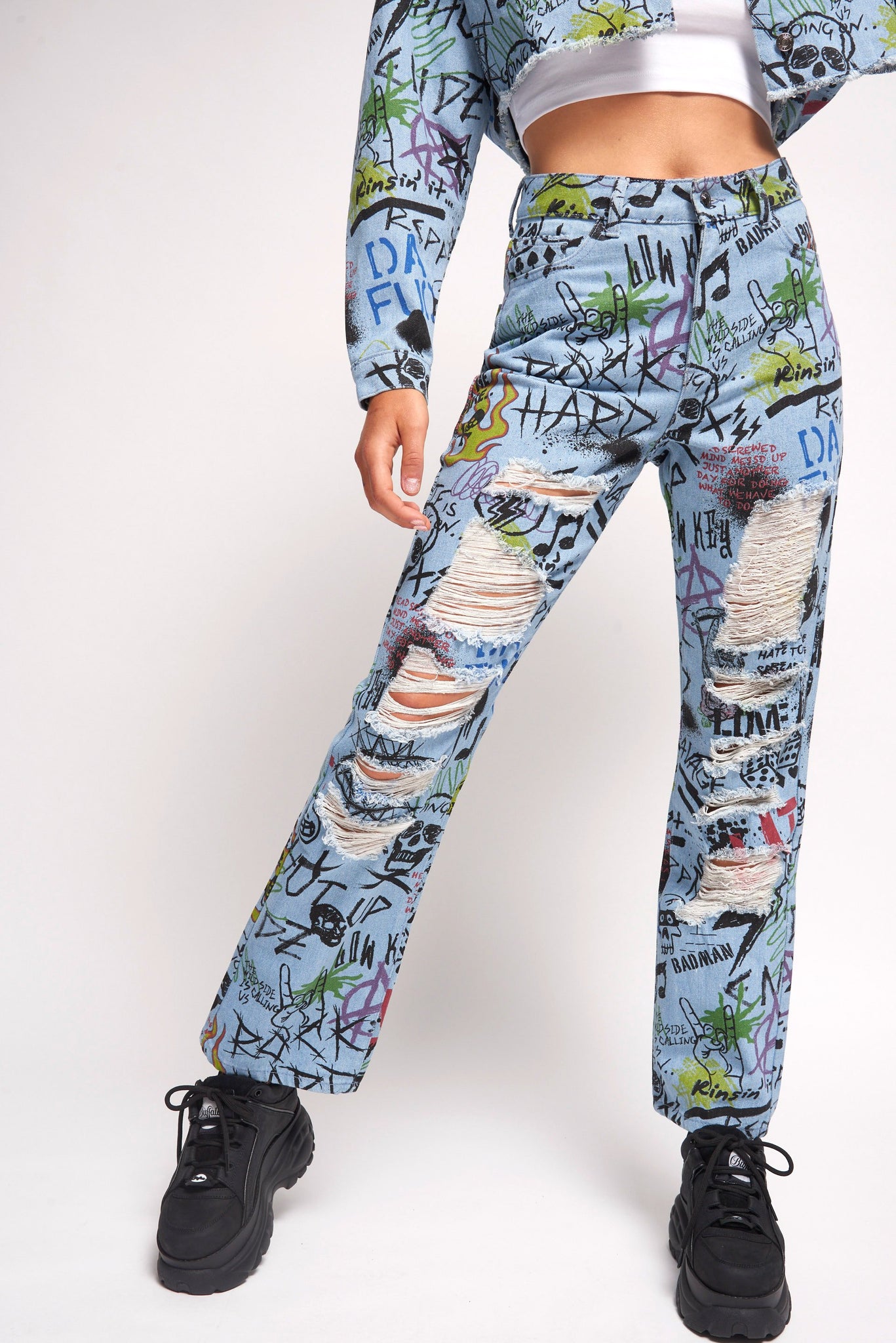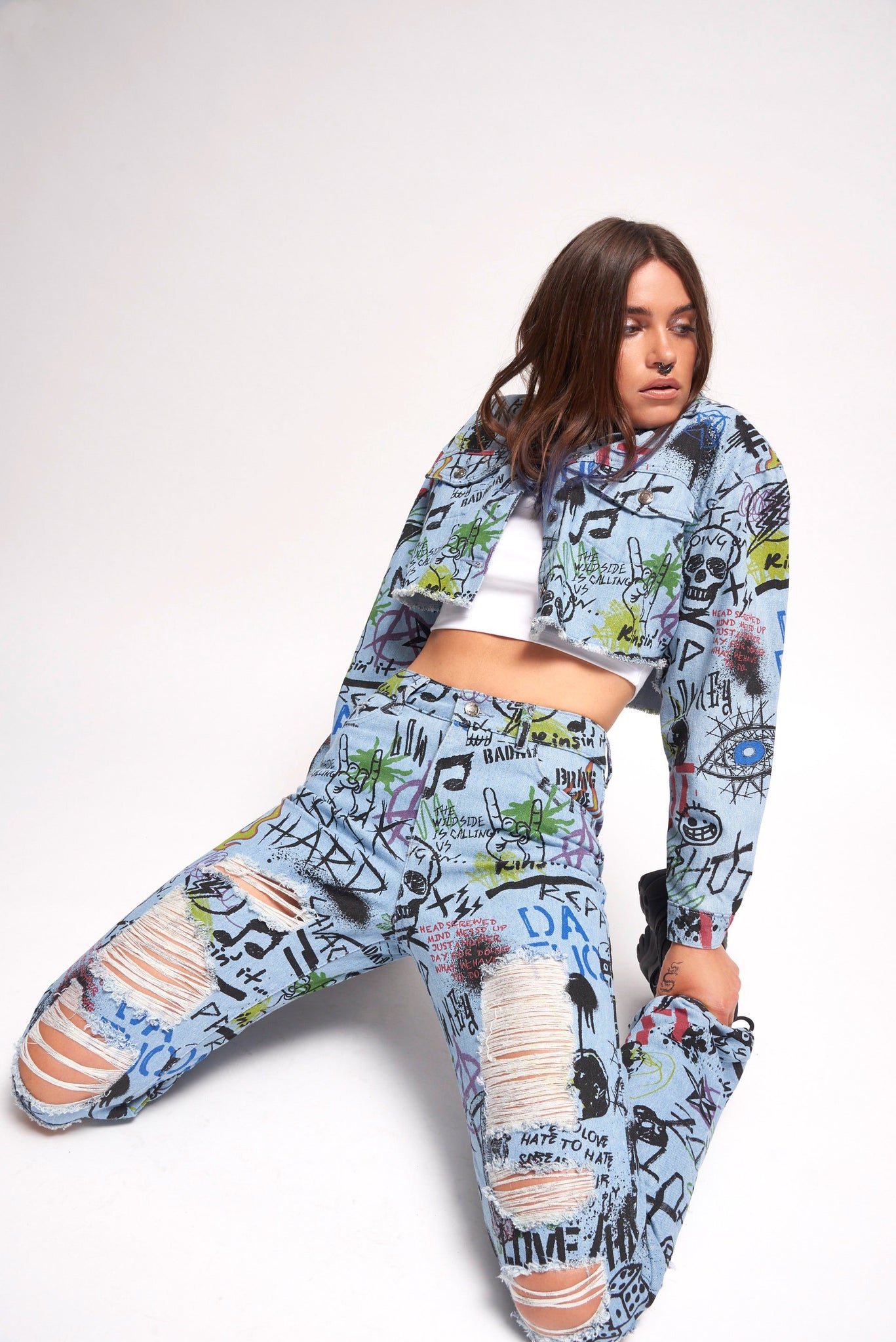 %text-1-start% Add some print to your wardrobe rocking our graffiti print extreme rip jeans, pair with the matching jacket and corset top for a kick-ass co-ord!