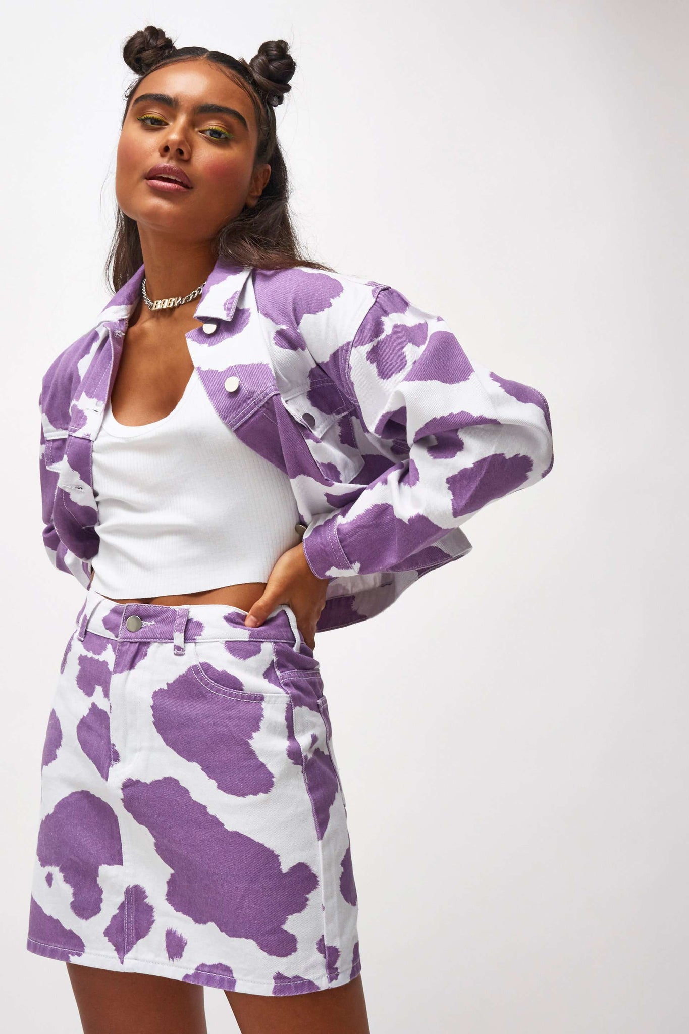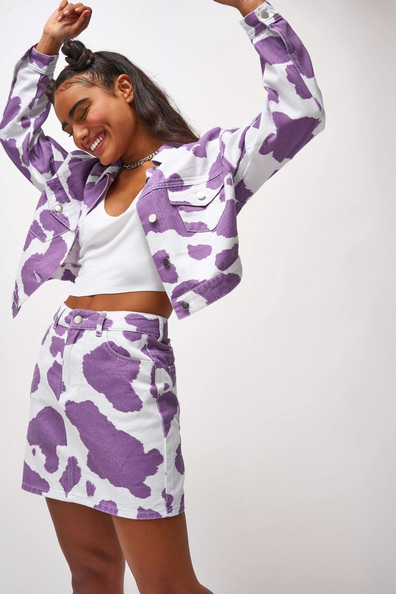%text-1-start%Holy cow, upgrade your summer wardrobe rocking our super cute lilac cow print denim jacket, pair with the matching skirt for the cutest co-ord!