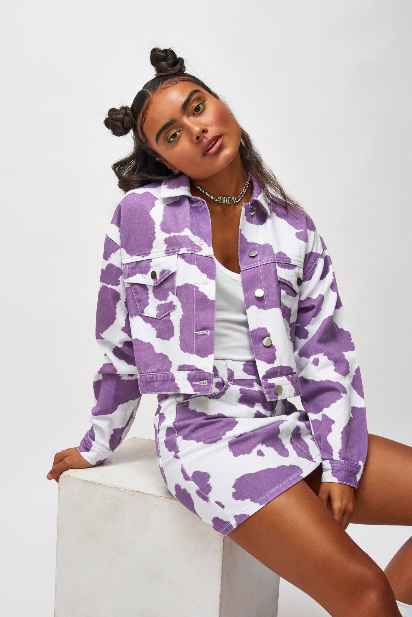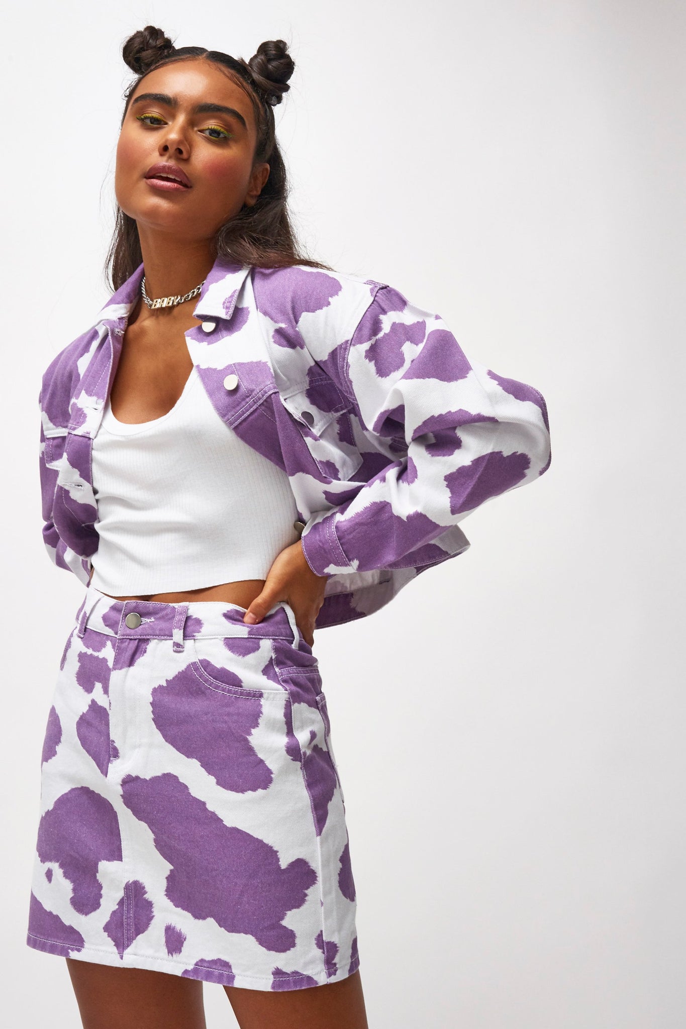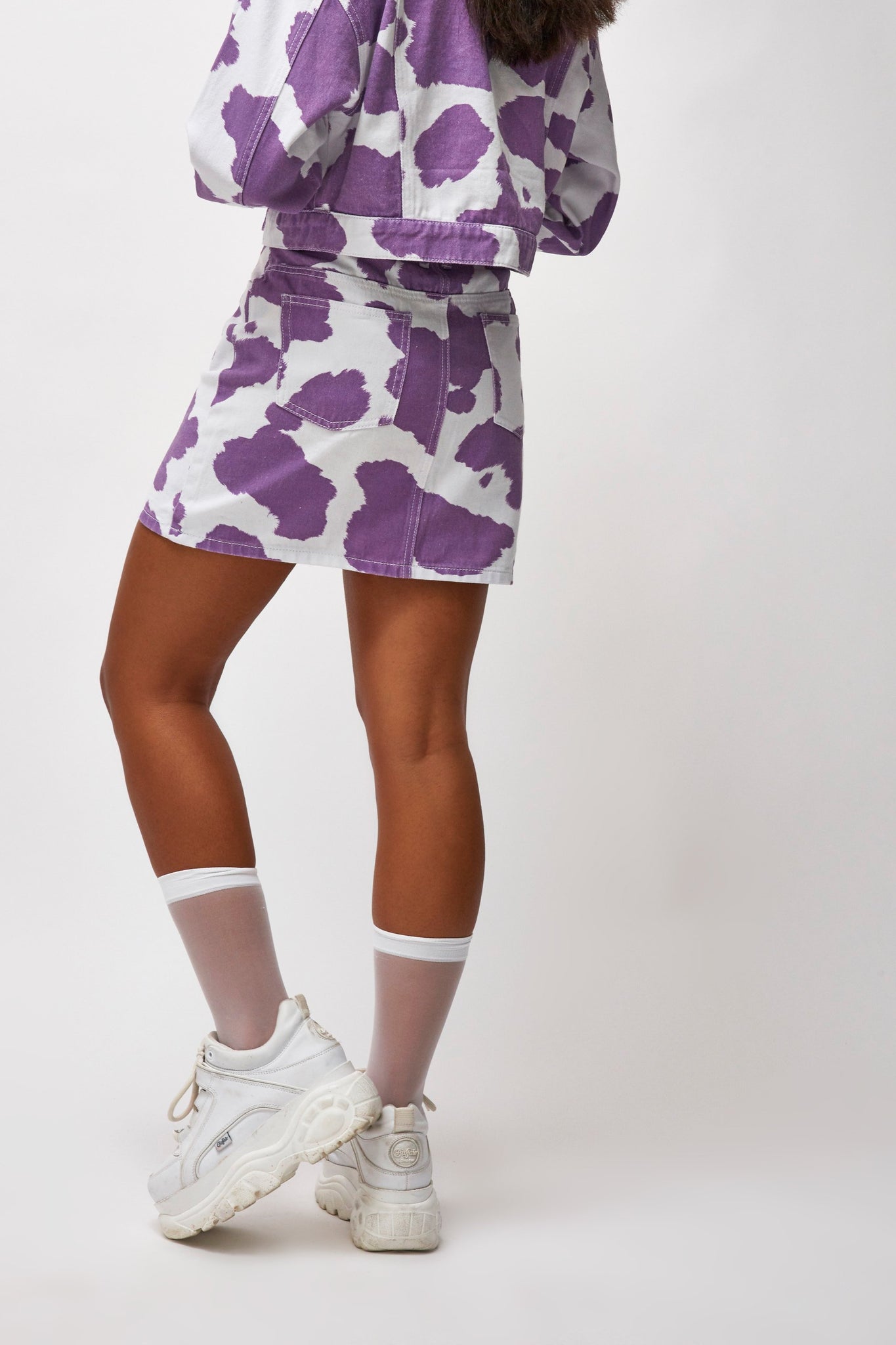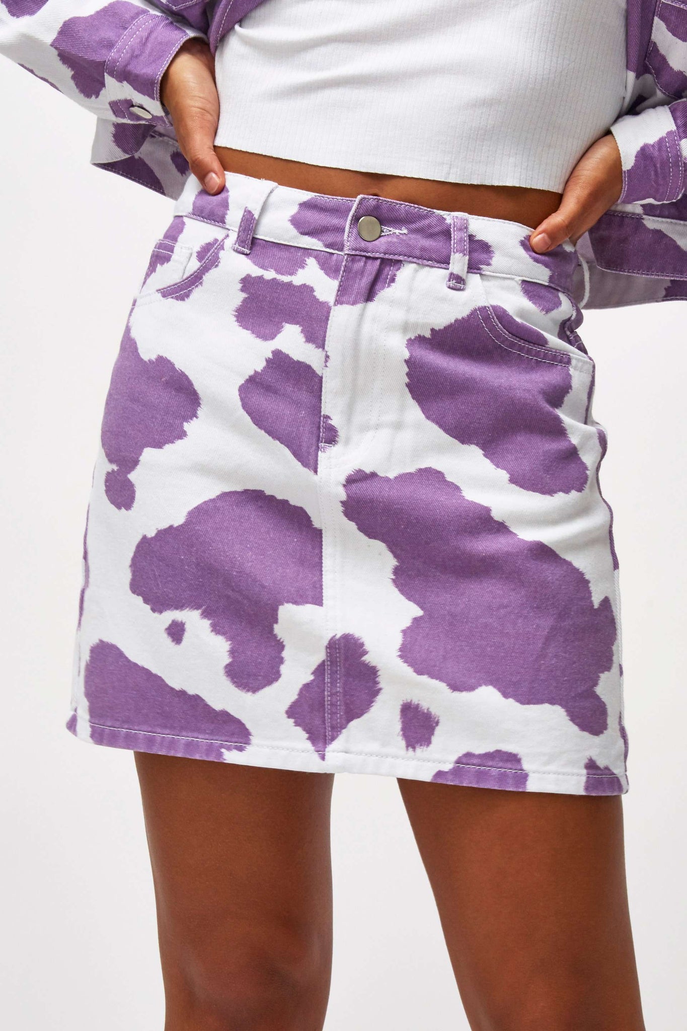 %text-1-start%Holy cow, upgrade your summer wardrobe rocking our super cute lilac cow print denim mini skirt, pair with the matching jacket for the cutest co-ord!