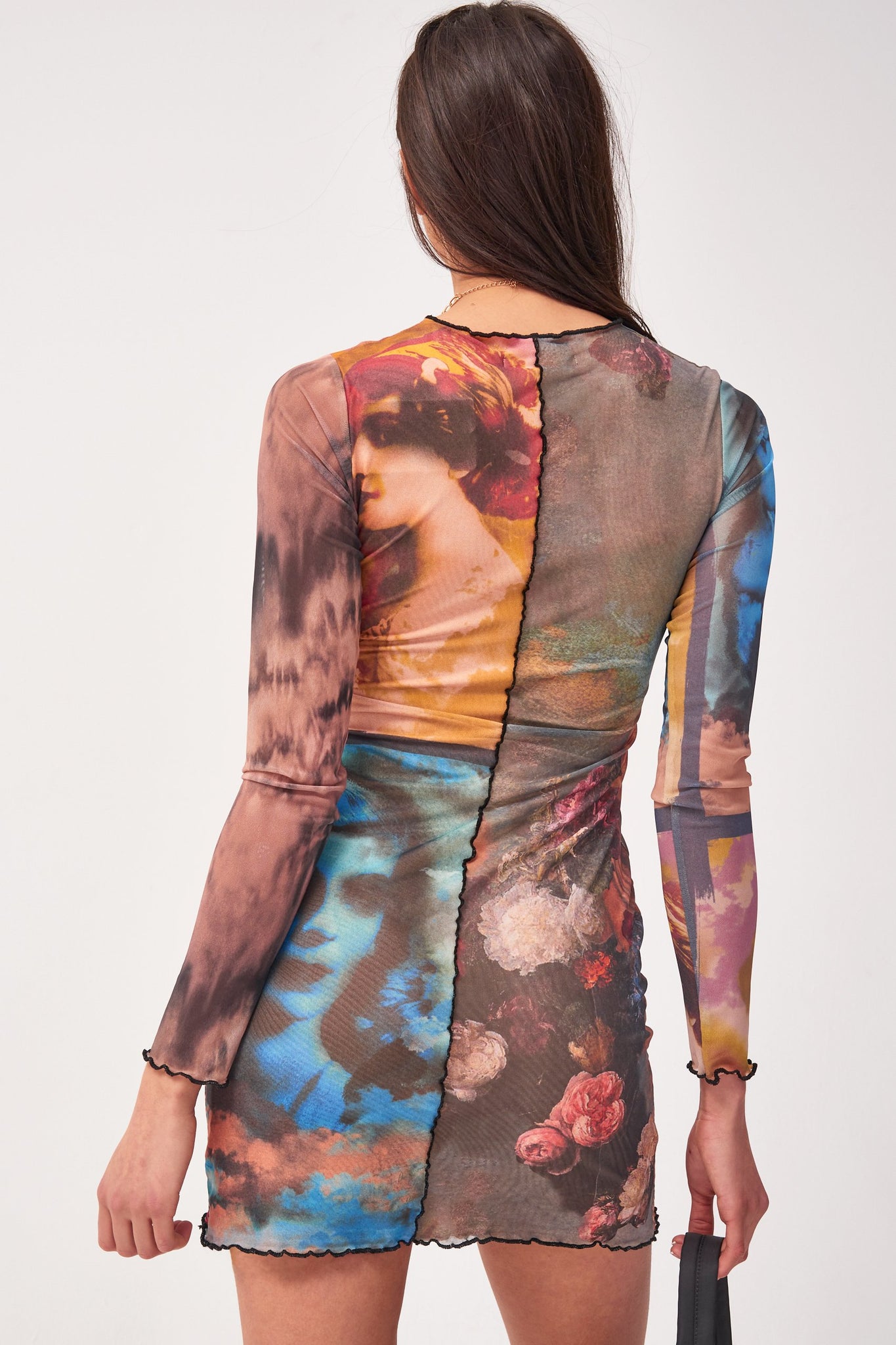 %text-1-start% Have heads turning this season rocking our mash up vintage print panelled mesh mini dress!