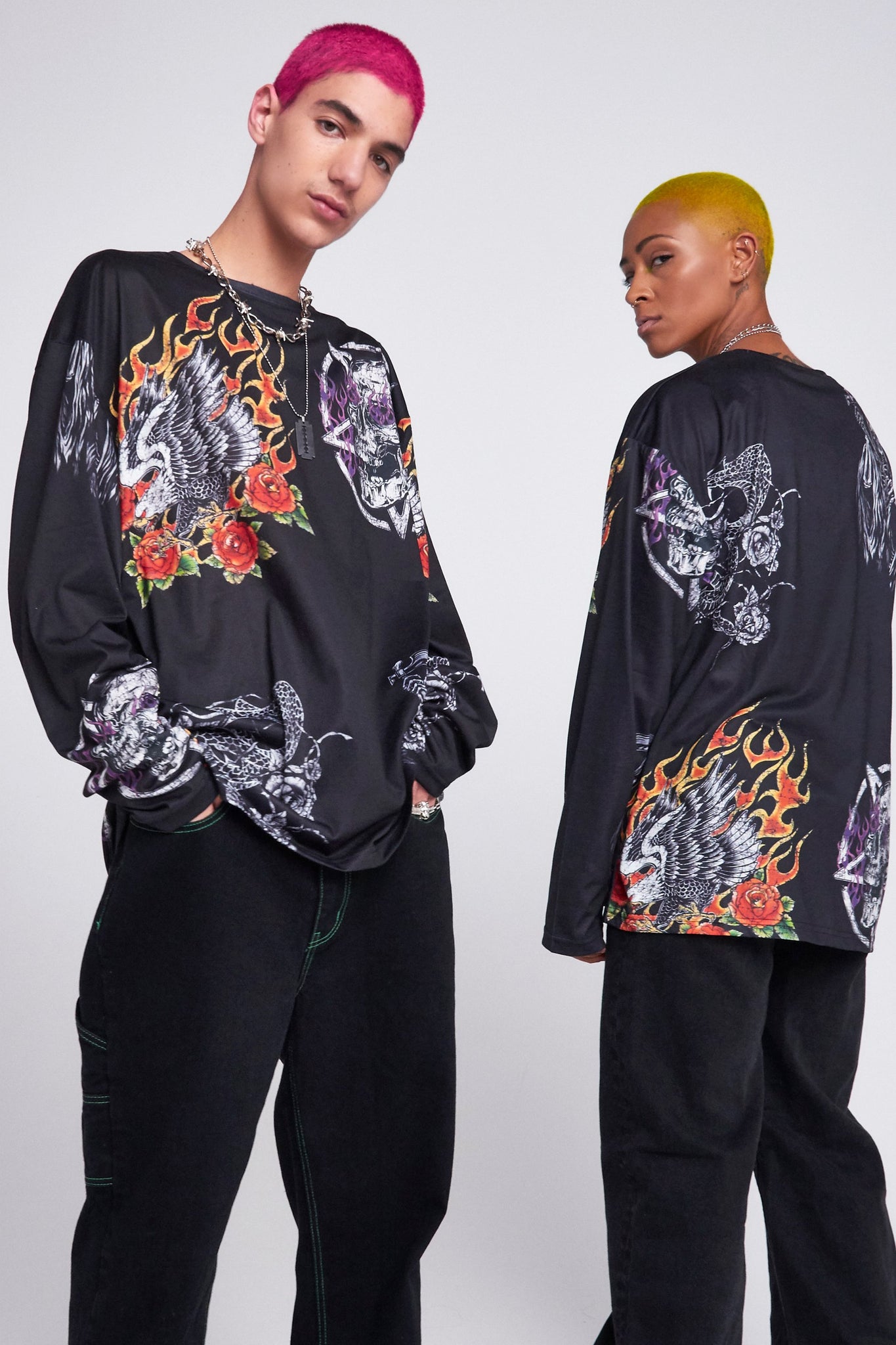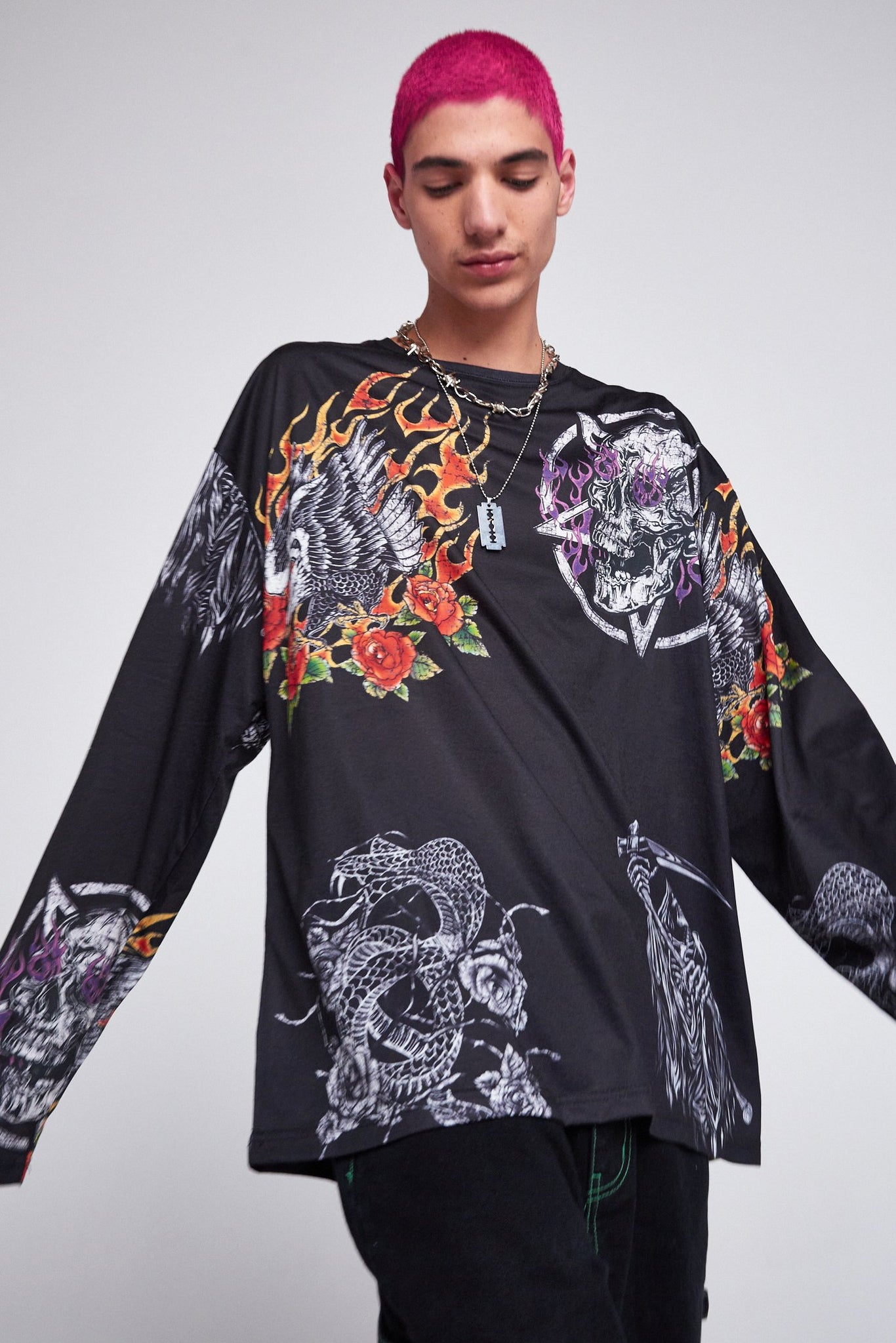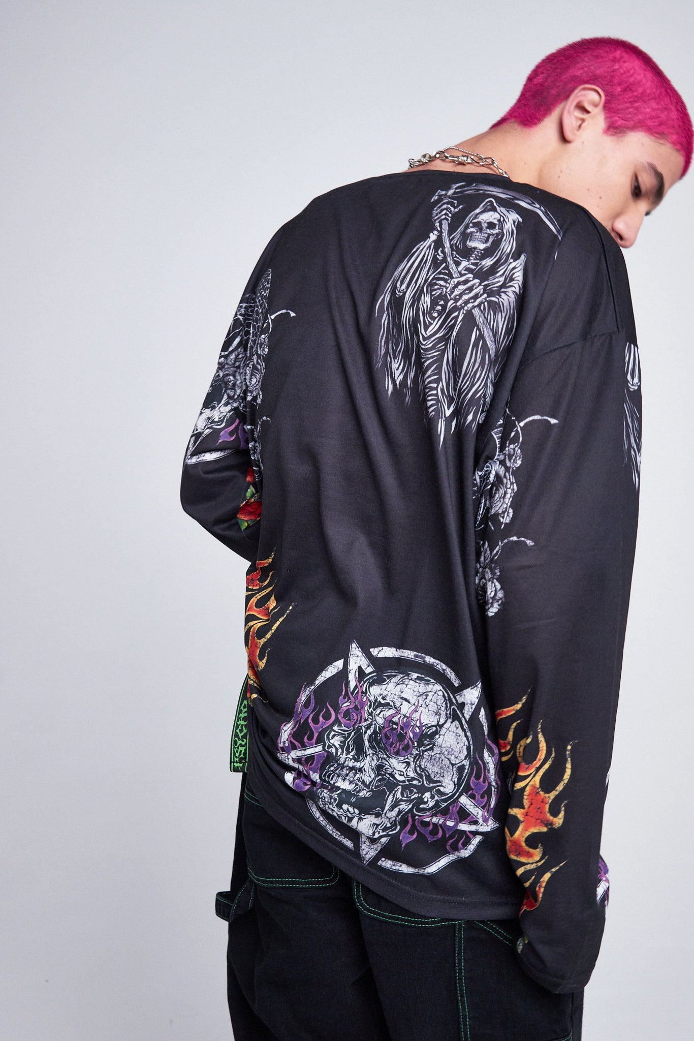 %text-1-start% Add some print to your wardrobe with our parallel gothic patches print long sleeve t-shirt!
