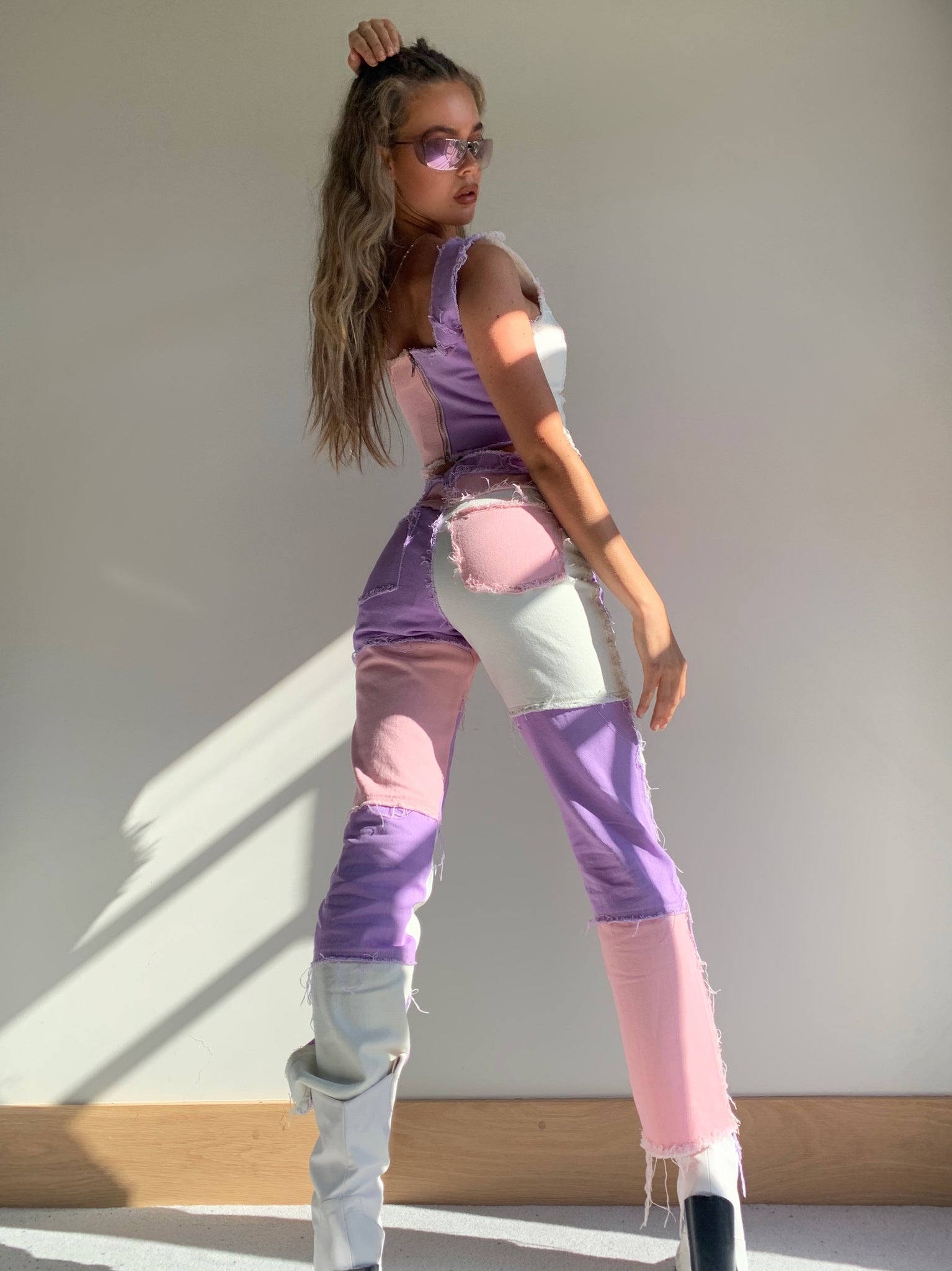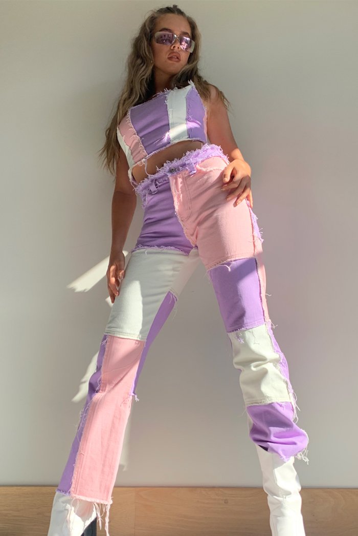 %text-1-start% Throw it back this season rocking our super cute pastel patchwork boyfriend jeans, pair with the matching corset top for ultimate outfit goals!