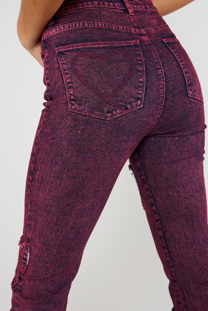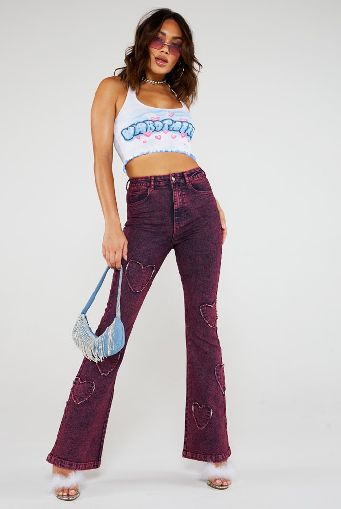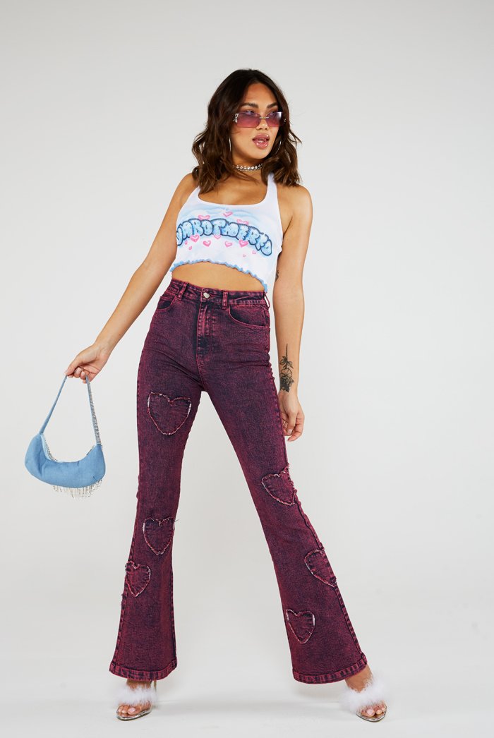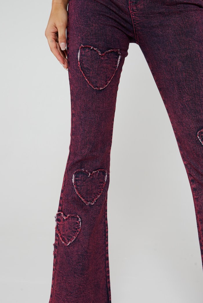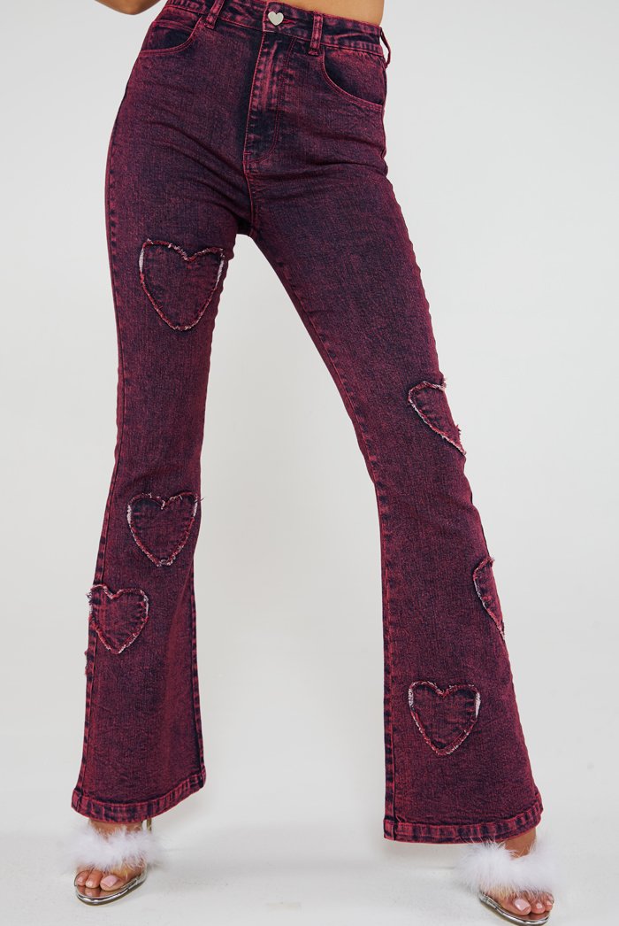%text-1-start% Wear your heart on your jeans! The perfect summer jean has just landed, rock our super cute pink acid wash boot cut jeans with heart applique detail!